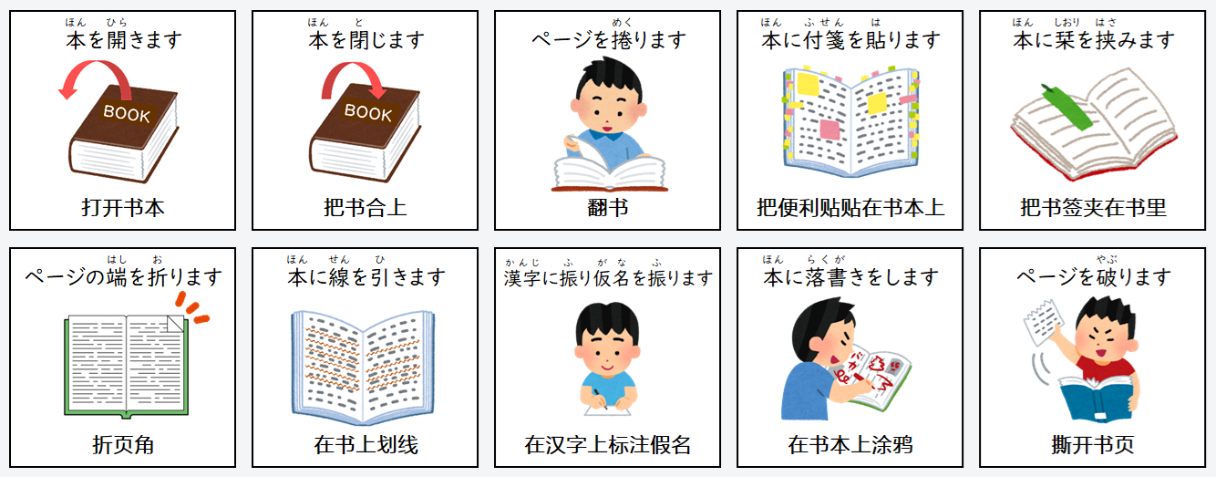 | 本に付箋を貼ります | 把便利贴贴在书本上 |