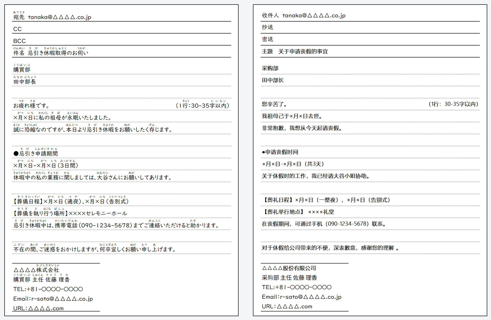 忌引き休暇中は、携帯電話(090-1234-5678)までご連絡いただけると助かります。 | 在丧假期间,可通过手机(090-1234-5678)联系。 |
