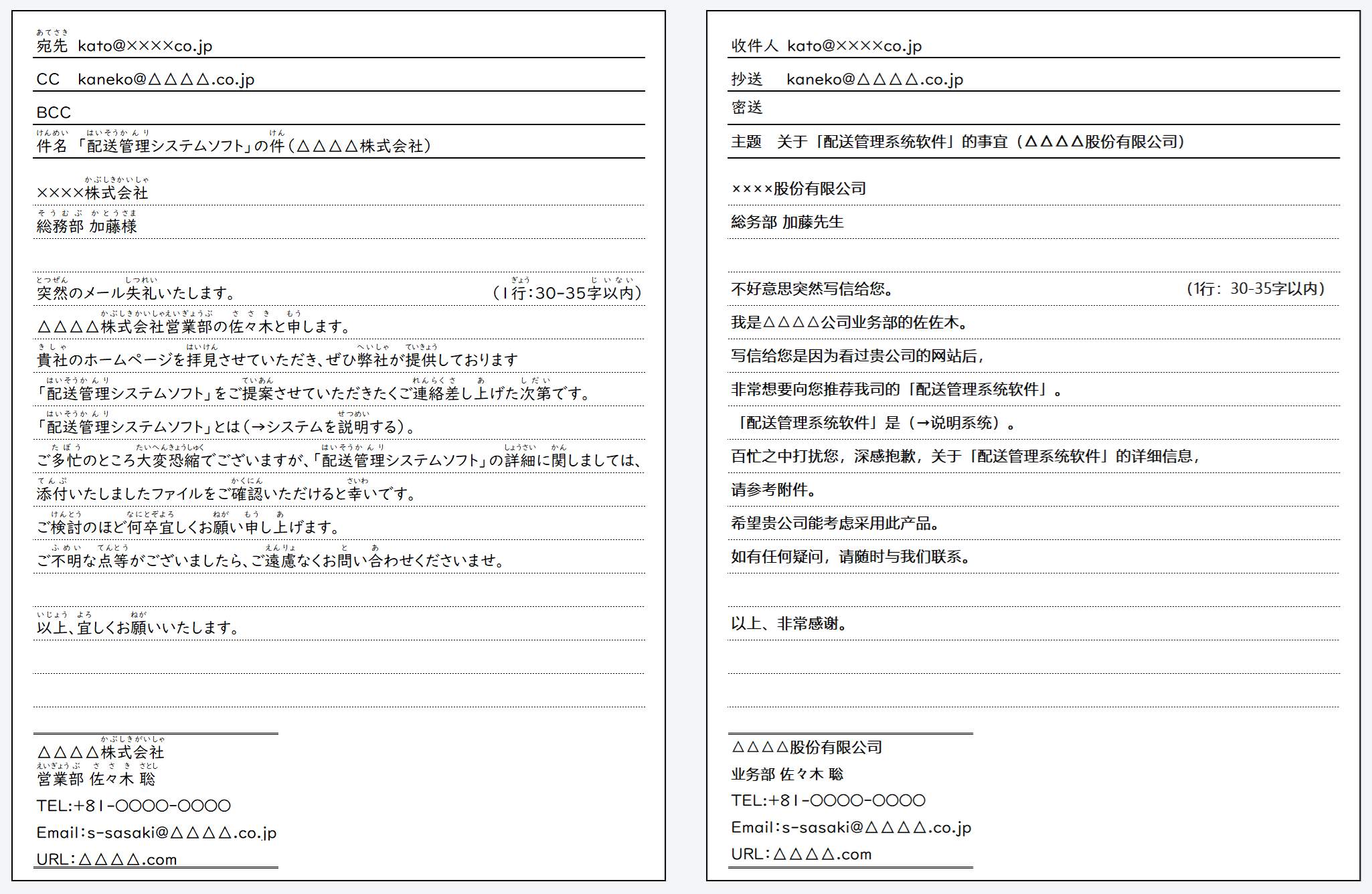 貴社のホームページを拝見させていただき、ぜひ弊社が提供しております「配送管理システムソフト」をご提案させていただきたくご連絡差し上げた次第です。 | 写信给您是因为看过贵公司的网站后,非常想要向您推荐我司的「配送管理系统软件」。 |
