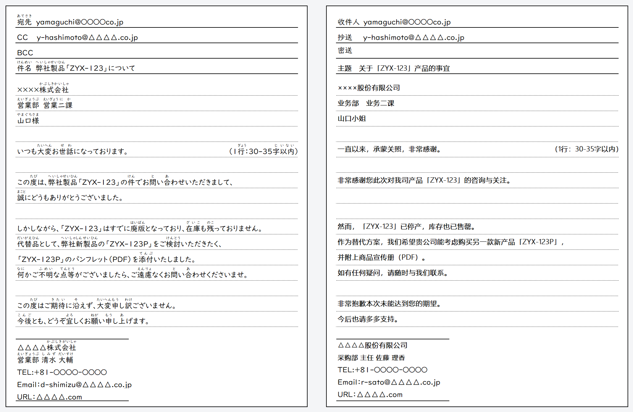 代替品として、弊社新製品の「ZYX-123P」をご検討いただきたく、「ZYX-123P」のパンフレット(PDF)を添付いたしました。 | 作为替代方案,我们希望贵公司能考虑购买另一款新产品「ZYX-123P」,并附上商品宣传册(PDF)。 |