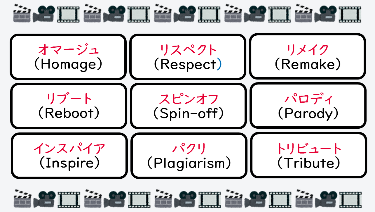 リスペクト (Respect)とは、しゃさくひんたいしてけいそんちょうしめすことです。リスペクト(Respect)はじんだんたいぶんかんけられるこうはんけいであり、オマージュ(Homage)はとくていさくひんせいさくしゃけられるけいになります。