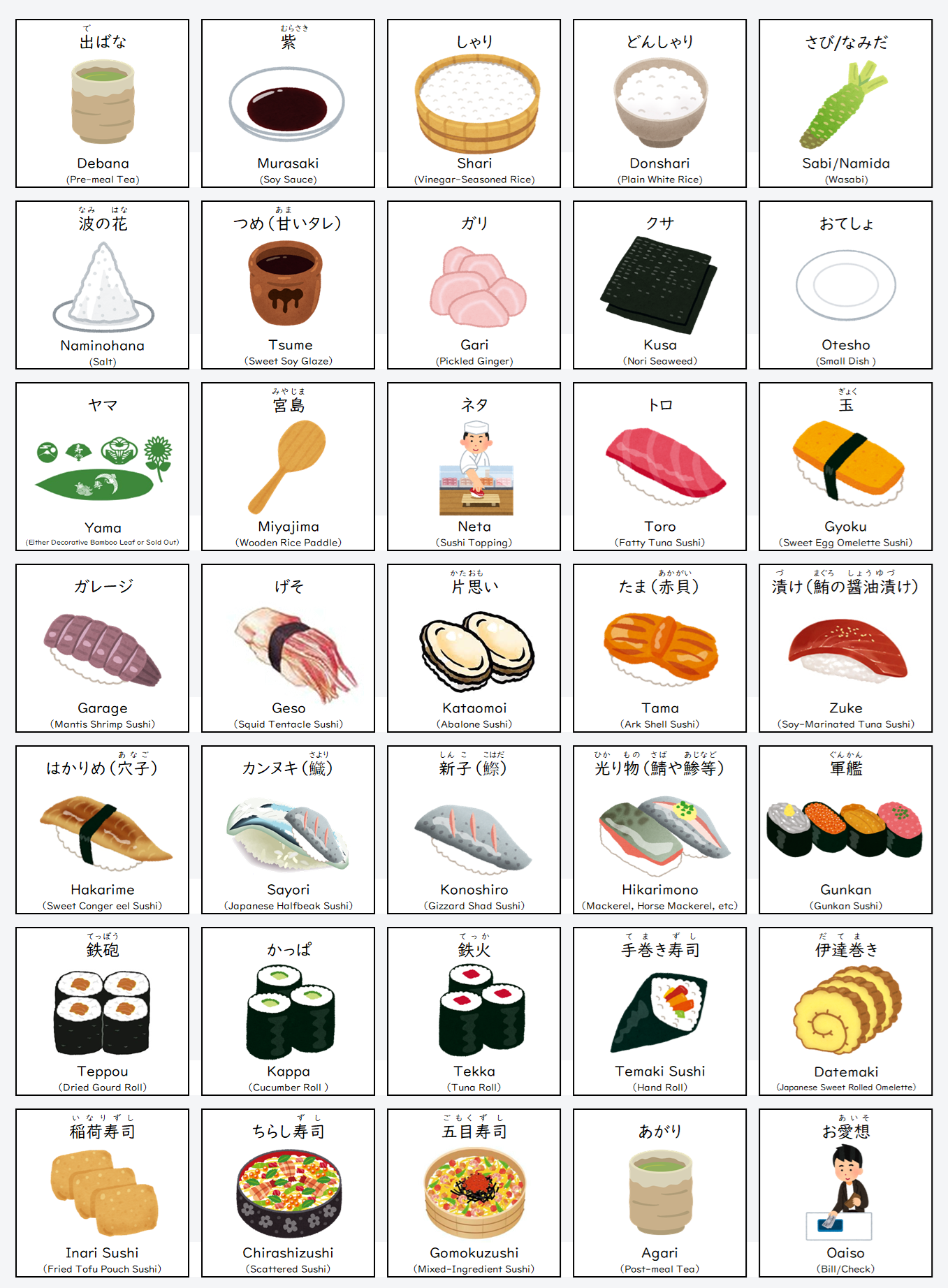 | 光り物(鯖や鯵等) | 鲭鱼或竹荚鱼之类的寿司 |